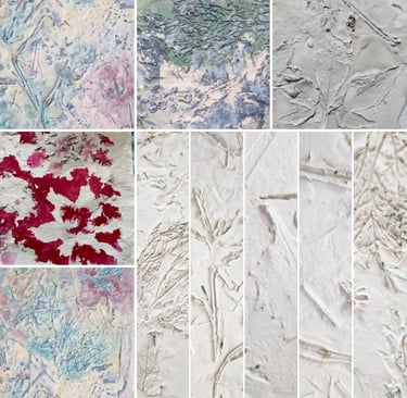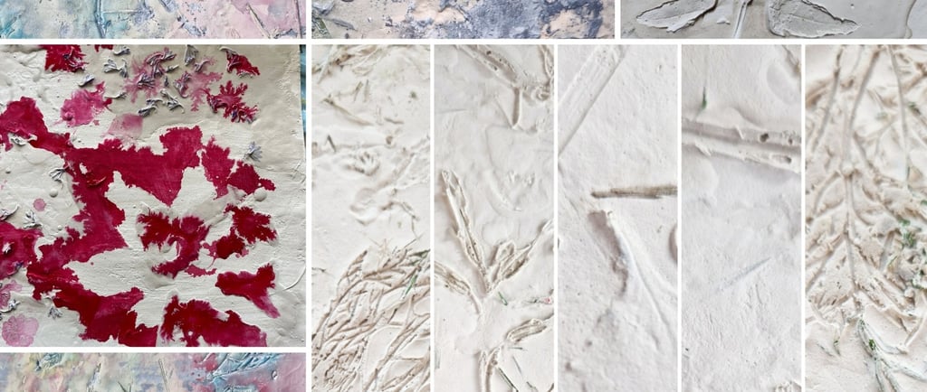 Hannah offered us tea during our gesso workshop, but when I saw what was bubbling on the stove I had second thoughts. Warm rabbit skin glue (vegan options are available) was on the menu - our gesso in preparation. What a great session - layering up this ever-thickening and whitening liquid into the perfect substrate for creating texture. We raided the garden for foliage and flowers, pressing it into the layers and forming a surface of contours and shapes. And when finally dry, we experimented with colour - inks, watercolours - whatever we had to hand. The result is a headful of ideas of how to incorporate this organic and textural technique into our work.